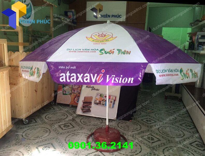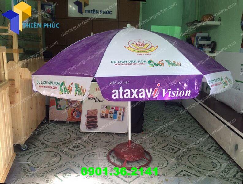 Những chiếc ô dù che nắng quảng cáo được in những thông tin liên quan đến khu du lịch làm tăng tính quảng cáo thương hiệu cho khu du lịch. Không chỉ che mưa, che nắng và mang bóng mát, sản phẩm ô dù che nắng quảng cáo của Thiên Phúc còn được thiết kế với những màu sắc sinh động. Đảm bảo bền, đẹp và tính thẩm mỹ cao cho không gian sử dụng của bạn.